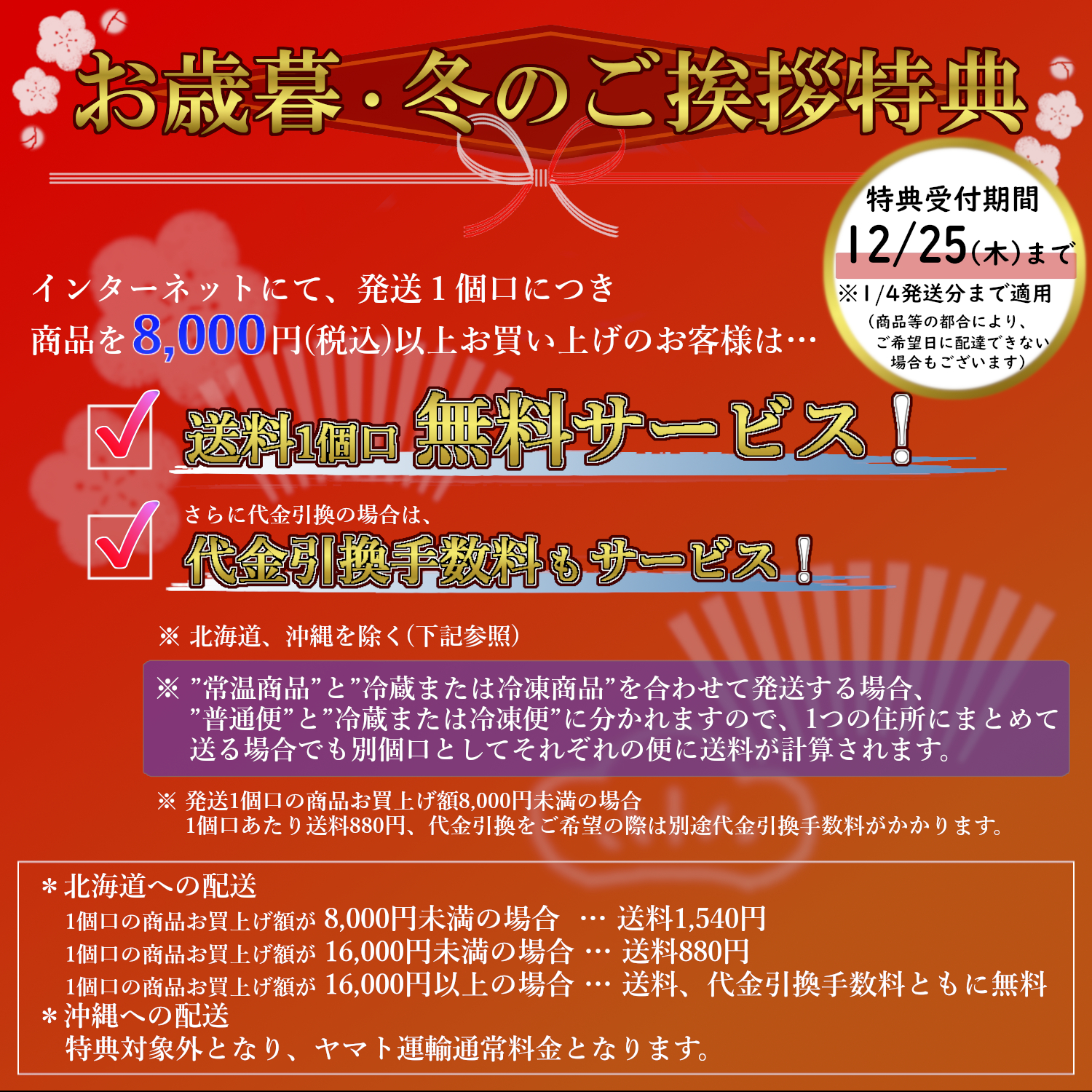 お届け先・お届け日が同じで、「普通便」「冷蔵便」「冷凍便」のいずれかにまとめて発送できる場合は、同梱してお送りします。
