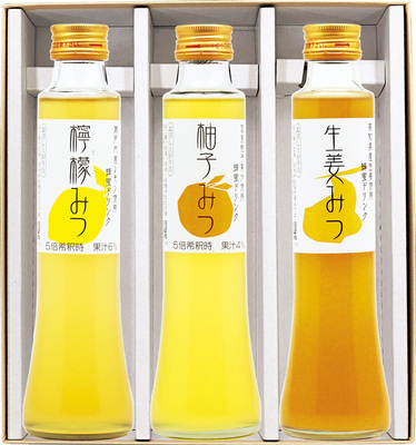 柚子みつ / 生姜みつ / 檸檬(レモン)みつ (各200ml)×各1本 (画像箱寸:7×21×27cm)
